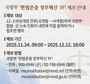 언론보도 바로보기 [보도정정] “계엄버스 장성 영전” 보도에 대한 국방부 입장 2025-10-24 보도 매체 JTBC ( 25.10.23.)□ 계엄버스 탄 장성 14명, 자리 지켰다 심지어 영전 ㅇ 12 3 비상계엄 당시 육군본부에..... [보도정정] 백마고지 유해발굴 관련 보도에 대한 국방부 입장 [보도설명] 중국산 부품 드론 1만여 대 군부대 투입 보도 관련 국방부 입장 언론보도 바로보기 게시판 더보기